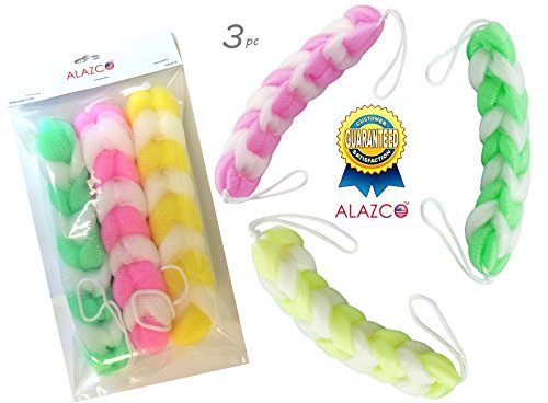 Mesh Bath Shower Back Scrub Stretchy Net Scrubber Braided Style Pouf Puff Nylon Gift - 3pc (One of each Color)