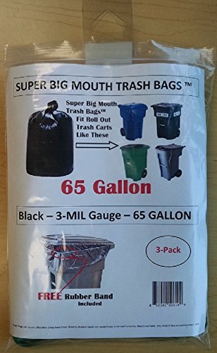 65 Gallon Super Big Mouth Trash Bags 3-Pack Plus 1 Free Rubber Tie Down Band
