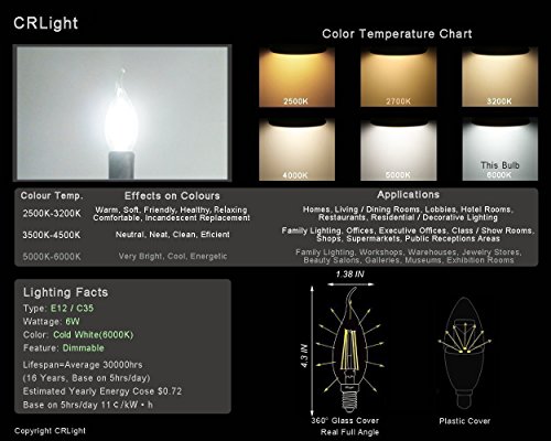 CRLight LED Candelabra Bulb 6W 6000K Daylight (Cold White) 700LM, 70W Equivalent E12 Base Dimmable LED Candle Bulbs, C35 Clear Glass Flame Shape Bent Tip, 360 Degrees Beam Angle, Pack of 6