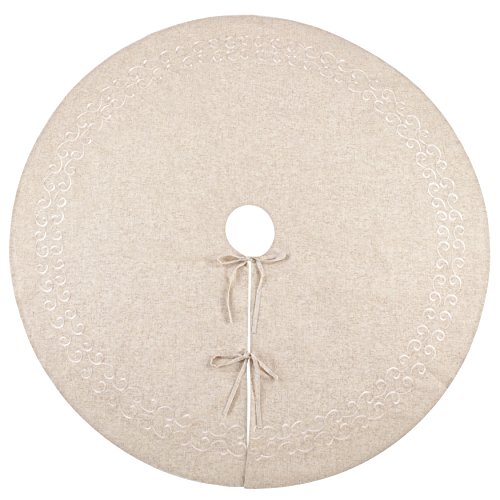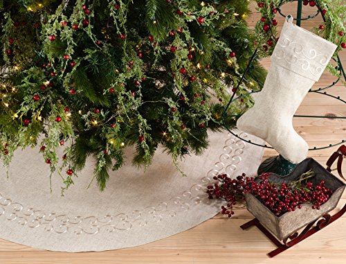SARO LIFESTYLE Embroidered Swirl Design Linen Blend Christmas Tree Skirt, 56", Natural
