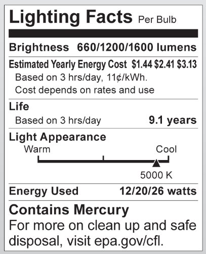 Satco S7343 12/20/26-Watt Medium Base 3-Way Spiral, 5000K, 120V, Equivalent to 30/70/100-Watt Incandescent Lamp