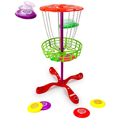 This family disc golf set from K-Roo Sports is just like the real thing, just miniature and perfectly portable. The target, called a "hole," stands 25 inches tall with an 11-inch basket and 14-inch stabilizing feet. Also included are eight 4.25-inch mini discs in four pairs of colors, which means up to 4 players (or 4 teams!) can play disc golf at the same time. Great for parties and family gatherings, or for a fun-filled day in the backyard or park.