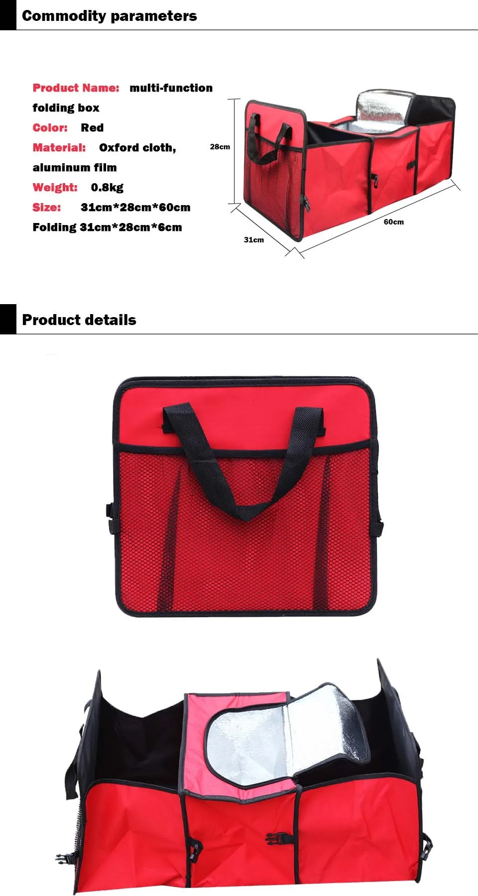 Brand Name:FUYOUSHENZHU Type:Trunk Box / Bag Material Type:Oxford cloth + aluminum film Name:automotive storage box, multifunctional folding bag Color:Red Weight:0.8 kg Specifications:60cm*31cm*28cm Features:practical, anti dirty, durable, convenient