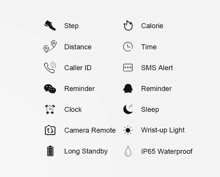 Function:Message Reminder,24 hour instruction,Passometer,Alarm Clock,Fitness Tracker,Call Reminder,Remote Control,Sleep Tracker,Push Message