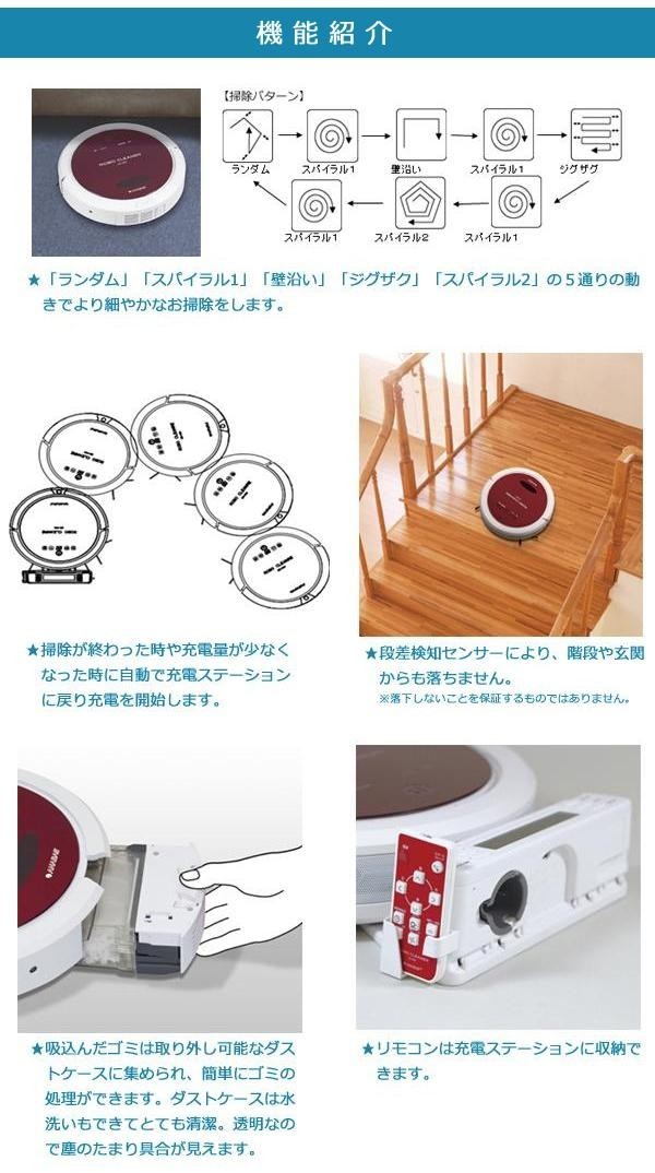 | 付属品 | 充電ステーション、充電池、ACアダプター、リモコン、コイン電池(CR2032)、集塵フィルター(予備1枚)、サイドブラシ(予備1枚)、取扱説明書、保証書(1年) |