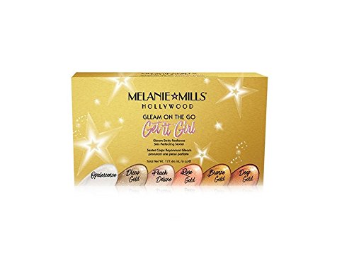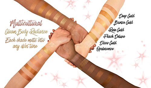 - GLEAMALICIOUS GLOW SET: Six luxurious shades to choose from - sheer Opalescence 1oz, sexy Peach Deluxe 1oz, luminous Rose Gold 1oz, radiant Bronze Gold 1oz, ultra-sexy Deep Gold 1oz & our party in a tube Disco Gold 1oz! Choose a shade that suits today’s mood or mix together to customize your look. Hollywood’s most desired body makeup collection kit!