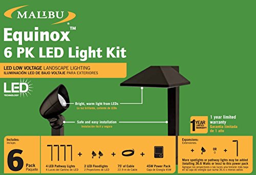 Malibu Equinox 6 PACK LED Light Kit LED Low Voltage Landscape Lighting, 4 LED Pathway lights + 2 Led Floodlights + 75' of Cable + 45W Power Pack 8409-1901-06