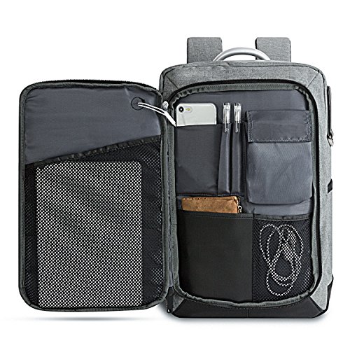 [BACKPACK WITH ORGANIZED SPACE] : 1 Computer compartment with padded slot for up to 15 15.6 inches laptop and Ipad. 1 pocket at the back for wallet, cellphone, other precious things. 2 front pockets for small notebooks, key ring, etc. 1 pocket with 7 compartments for cellphone, power bank, headset, usb cable, cards and pens. 2 expandable side pockets