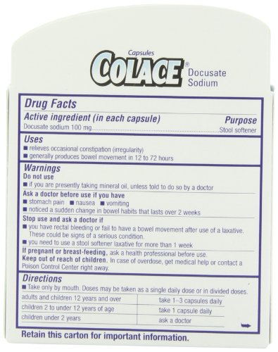 Stimulant-free for comfortable relief from occasional constipation. Colace Stool-Softener products contain docusate sodium, which relieves occasional constipation and may be useful for people with health conditions where stool softeners help to avoid straining or uncomfortable evacuation.Feature