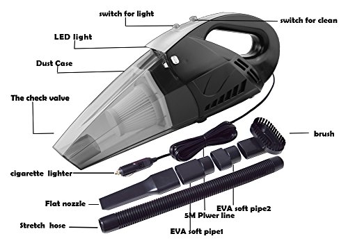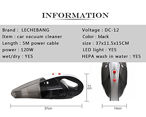 -. Feature : Easy to Use & Clean Up: comes with 3 accessories. The Brush is used for cleaning the carpet/cushion/air conditioner outlet. The Extension Hose is used for connecting with other accessories to clean the corner. The Crevice is used for cleaning the gap. The filter can be taken out of and flush with water, you can use a toothbrush to gently wash detergent plus, so the filter of LECHEBANG hand vacuum is washable and reusable. / Powerful Suction: 12volt, 106w, 4300PA - 4500PA suction. 75db low noise with stainless steel HEPA filter, can effectively clean the dust inside the car. The power cord of this handheld auto vacuum cleaner is 4.5 meters(14.8 feet) long, It can clean anywhere in your car. / LED LIGHT: With built-in LED light, you can clean in dark place and dark corner with no trouble, making your cleaning job more easier and quicker. / WASHABLE& REMOVABLE HEPA FILTER :reusable and One-Step Empty, do not need to change filers and spend any money more, just wash it by water, economic and environmentally friendly. But wet filter will hinder the suction ,so please dry the filter before use! car vacuum support dry and wet use. Can efficiently suck up dust and spilled water. / GOOD SERVICE: Any question, please email us, we will response you within 24 hours, and we will also provide you technical support. We offer ONE YEAR GUARANTEE. Tips: Start the engine before pling the car vac , it will be more powerful.
