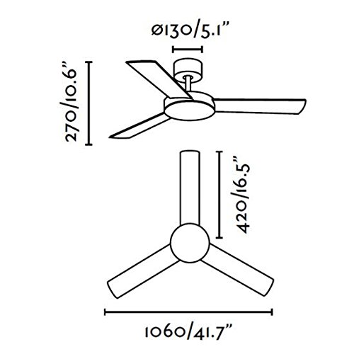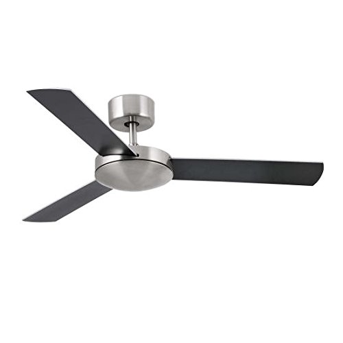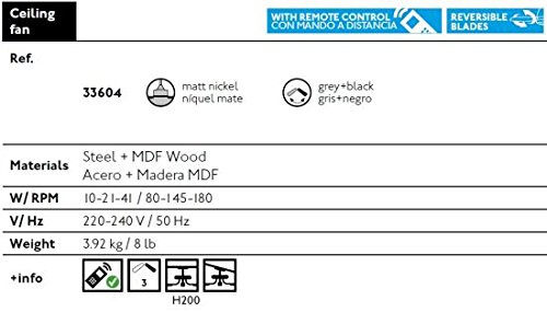-. Feature : Deckenventilator Lorefar MINI MALLORCA Faro 33604 Motorgehäuse Nickel matt / 3 Geschwindigkeitsstufen 80-145-180 Umdrehungen pro Minute bei einer entsprechenden Leistung von 10-21-41 Watt / 4 MDF-Wendeflügel in Schwarz und Weiss Durchmesser 106 cm geeignet für Räume bis ca. 13 m2 / Vor- und Rücklauf für Sommer- und Winterbetrieb, Montage auch an schrägen Decken / Inklusive Fernbedienung