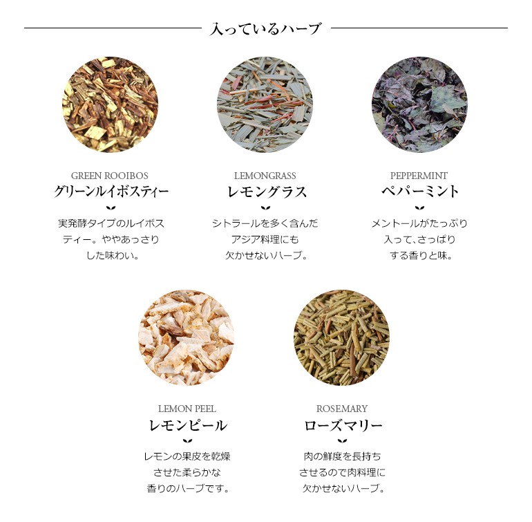 | 産地 | グリーンルイボスティー:南アフリカ共和国 レモンピール:タンザニア ローズマリー:モロッコ レモングラス:パラグアイ ペパーミント:オーストリア ※時期やロットよって変更する場合がございます。 | 味の特徴 |