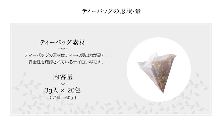 ポットにティーバッグを入れ、200~400ccのお湯を注ぎ、3~5分蒸らしてお召し上がりください。(蒸らし時間が長いほうが濃くでます)お湯の量はお好みで調整してください。