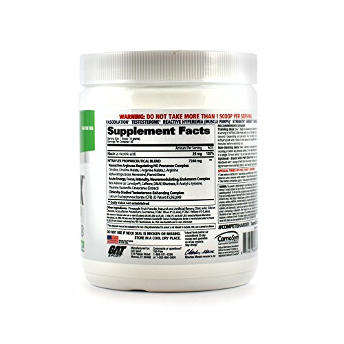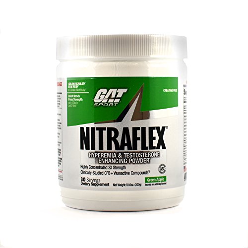 GAT Nitraflex - Green Apple - 300 gHyperemia & Testosterone Enhancing PWD (Clinically-Studied CFB & Vasoactive Compounds). Highest Concentration (More than 3x Strength): 1-Scoop Potency. Reactive hyperemia describes the increase in muscle blood flow that occurs during high-intensity resistance exercise and produces the "pump" associated with increases in muscle size. The Nitraflex pretraining formula contains ingredients that in vitro, animal and clinical studies suggest possess properties that may help advanced athletes maximize energy, intensity, vascularity and reactive hyperemia (pumps) during their workouts, and provide long-term support of testosterone and nitric oxide levels in the healthy range when used as directed. Unique Properties of some of the key compounds in Nitraflex: 1-Scoop Potency: Nitraflex is so potent, only 1 scoop (1 serving) is necessary. Do not exceed 1 scoop in a single 24-hour period. Do not take Nitraflex with 5 hours of bedtime. High Citrulline: Arginine Ratio: Arginine is a proven precursor in nitric oxide (NO), a vasodialator. Testosterone: Calcium fructopyranose borate (CFB) has been shown to increase testosterone in health subjects. The average increase in total and free testosterone in a 6-week study was 56% and 29.5% respectively. Effective Doses of Beta-Alanine: we added an exceptionally powerful does that you will feel working following your very first serving. Creatine-Free: Creatine causes water retention, which can make achieving a dry, hard muscular look even more difficult. (When you see yourself getting bloated, you may be fooled into thinking the product is "working.") We left it out of Nitraflex precisely for this reason. Cognitive Enhancers: Nitraflex contains unique ratios of scientifically validated compounds that help you remain alert, intense and focused while you're flying from set to set with veins fully dialated and muscles pumped to the Extreme.