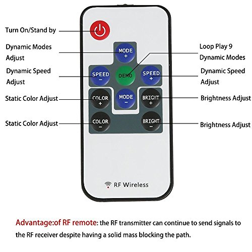 - ☀Upgraded 360° Free Control RF wireless remote help you creative the fantasy light effect more freely! 20kinds of stable colors, 18kinds of color changing models, 6levels dimmable function, 6levels speed. No need to aim at the receiver, even penetrate walls and doors, no conflict with TV remote controller