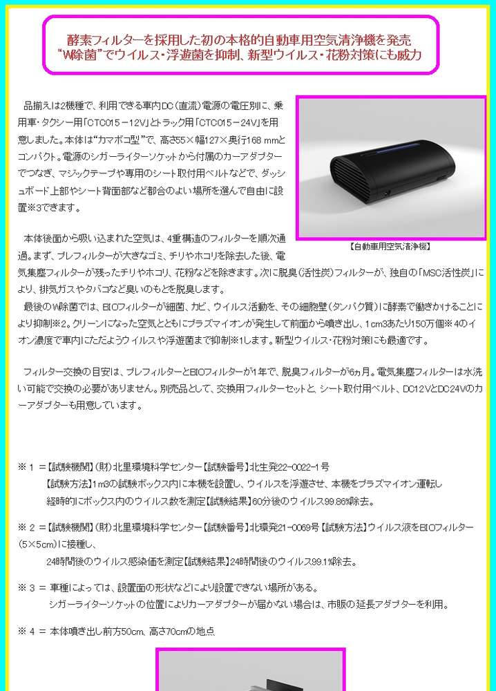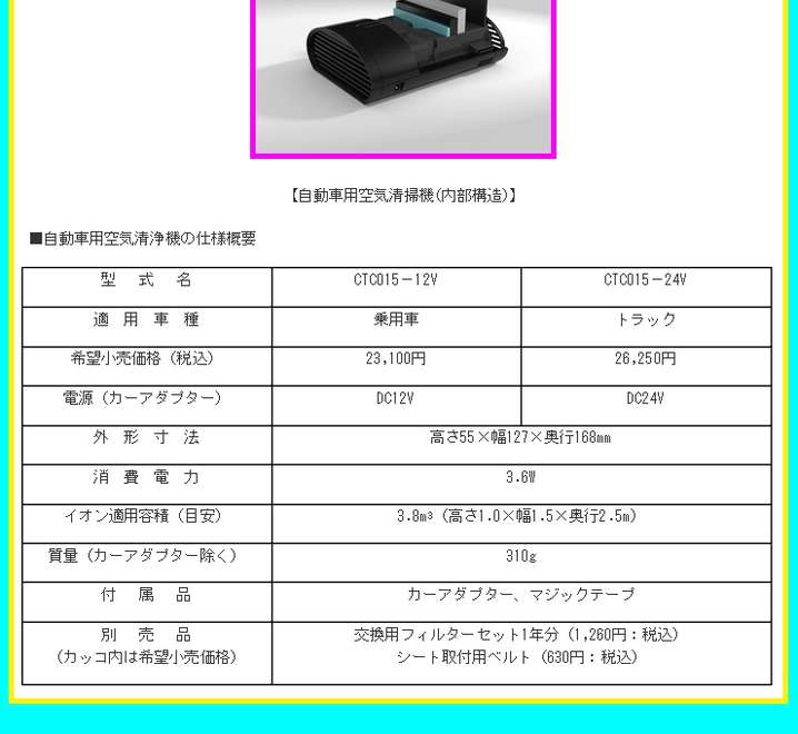 ●別売品として、交換用フィルターセットと、シート取付用ベルト、DC12VとDC24Vのカーアダプターも用意しています