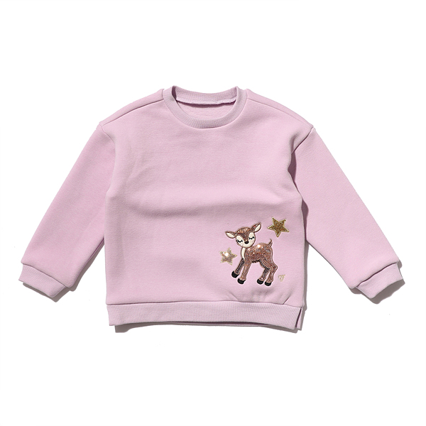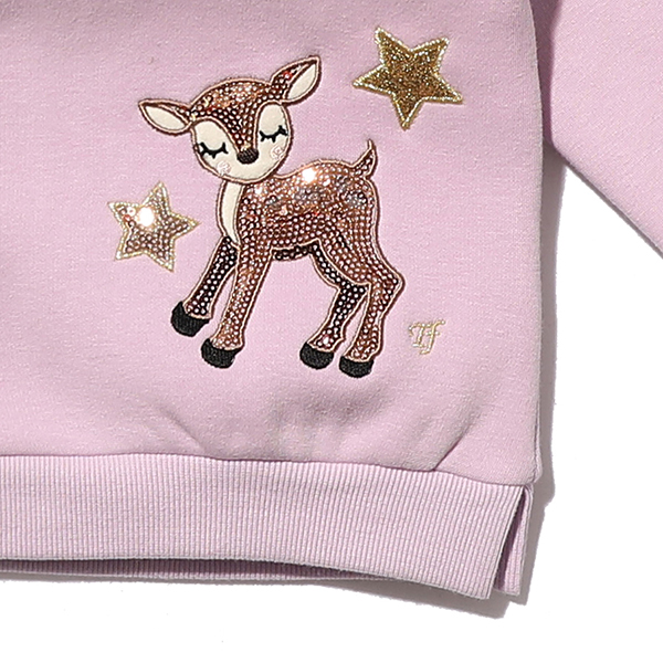 -하단에 골드스팽글 사슴 캐릭터와 별장식으로 포인트를 준 티셔츠