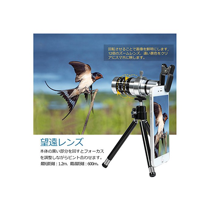 【망원 렌즈】12배의 망원 렌즈,먼 경치를 클리어와《스마호》에 비치게 합니다.본체가 검은 부분을 돌리면 포커스를 조정 하면서 punt 맞게 합니다.최단거리:1.2m,최원거리:600m.눈으로 분명히 안보인 대상물을 깨끗함으로 찍는 것 를 할 수 있습니다.