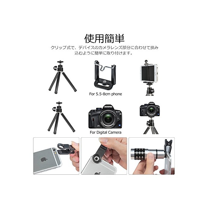 【카메라/《스마호호루다》/삼각 첨부 와】첨단에는《스마호》,디지탈 카메라,일안레플렉스,콘 디지털 등,나사혈에 직접 고정하는 타입으로 대응.소형 알루미늄제 삼각과 고정용 홀더가 부속하고 있고 스마트 폰을 평탄한 장소로 설치 해 촬영 하는 것도 가능합니다.미니 삼각은 내구성이 있는 스테인레스 재료를 이용해 보다 길게 쓸만합니다.또한안정 적으로 양방의 부품을 고정하기 위한 나사를 잠그고, 링을 매개해 렌즈를 붙여 붙입니다.