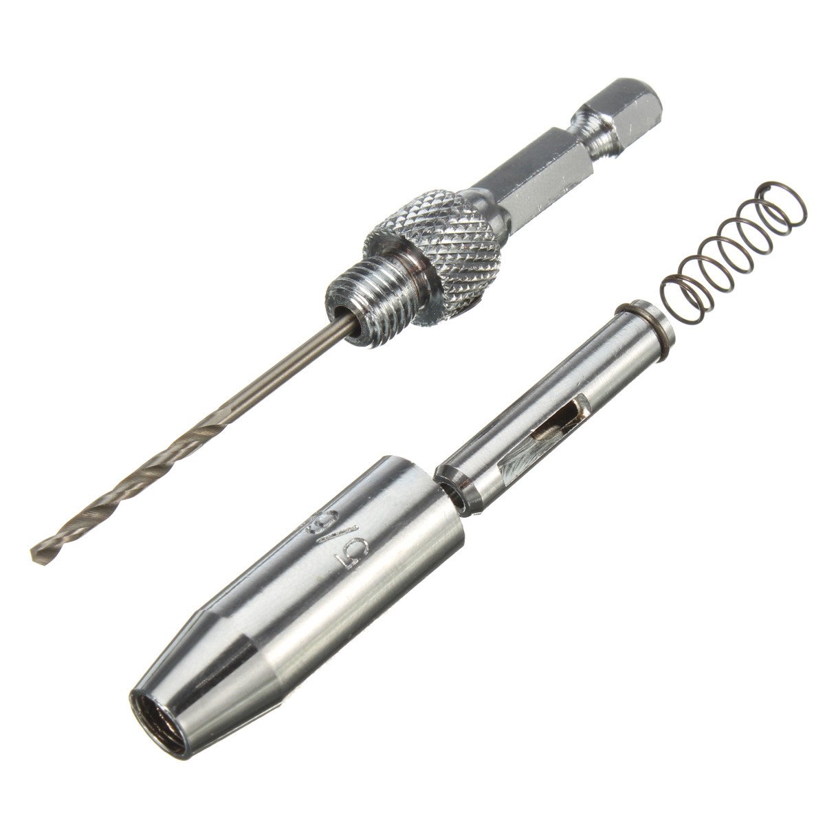 - Bit is surrounded by a spring type guide with a window that displays the bit depth of the drill during adjustment.