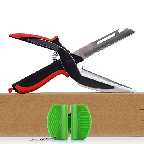 -. Feature : ✔ Multipurpose kitchen scissor - replace your kitchen knives and cutting board, you can use it cut, chop, slice, dice, peel, carve and open bottles / ✔ Easy to cut up any veggies or prep fruits without pulling out a cutting board and knife, you can chop everything directly into your bowl, save your space and time and fewer things to wash after cooking / ✔ It works very well for things like carrots, tomatoes, onions, cheese, lemons, cucumbers, zucchini, more vegetables and prepping fruits, save a lot of time and with locking safety hinge helps prevent accidental cuts / ✔ With locking safety hinge helps prevent accident cuts, also for long term perfect cutting, we have added a 2 in 1 sharpener in the box / ✔ NO RISK PURCHASE - If our scissor cannot satisfy you, just send us a message and we will refund your money, no question asked. Please attention: 1. Please do not keep this within the reach of children. 2, We update the package of replenish goods, P.R.Inted our logo on it
