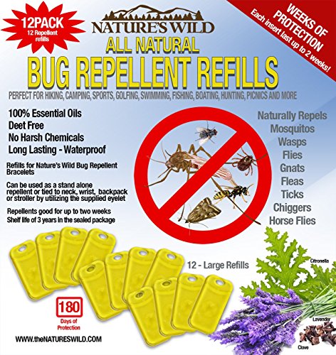 -. Brand : Nature's Wild -. EAN : 0711599319311 -. Feature : SAFE FOR THE WHOLE FAMILY - It's time for an all natural approach that is easy on the senses and offers lasting protection from Mosquitos, Gnats, Ticks, Wasps, Fleas, Moths, Chiggers and House Flies. Expectant and Pregnant mothers can protect from annoying and dangerous insects while knowing that they are not coating themselves with harsh, Deet based chemicals. / SMELLS GREAT - Nature's Wild bug repellents offer a pleasant smelling scent of natural oils that offers days of waterproof protection without the discomfort and odor of traditional mosquito repellent sprays or lotions / SAVINGS - 12 refill capsules. Each capsule provides protection for up to 15 days, which gives you 180 days total of 24 hour protection. Stop buying expensive sprays and lotions or cheap throw away disposables. For maximum longevity, place refill capsules in a resealable bag between uses and store in cool, dry temperatures / USE IN BRACELETS OR BY THEMSELVES - Refill capsules are the perfect fit for our bracelets, but also be used by hanging from supplied eyelet and attach to your neck, wrist, a backpack, belt loop, hat or stroller. Stop avoiding nature because nature won't leave you alone. Perfect for camping, golfing, gardening, picnics, bbq, swimming, boating, horseback, hiking, cycling, fishing, boating, campfires, and sports. / 100% GUARANTEE - Gardeners have known for generations that planting certain plants will attract desirable butterflies and hummingbirds while planting others will repel harmful insects. Our enhanced formula of plant extracts has provided excellent results for our customers. 30 day money back guarantee. Note - These fragrances are effective in repelling insects. For best results, wear after a clean shower without perfumes, deodorants or hair care products that may actually attract insects. -. PackageQuantity : 12 -. ProductGroup : Lawn & Patio -. ProductTypeName : OUTDOOR_LIVING -. Title : Bug and Mosquito Repellent Refill for Bracelets by Nature's Wild - Natural Solution to Repel insects with Deet Free Essential Oils - 12 refills -. UPC : 711599319311