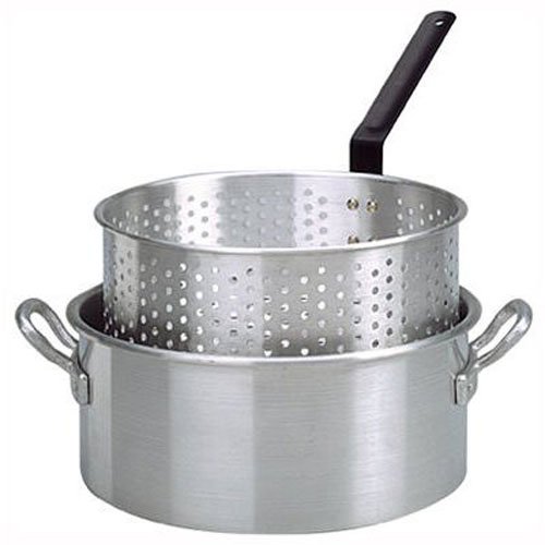 Aluminum deep fryer with two helper handles and punched aluminum basket with heat resistant handle.
