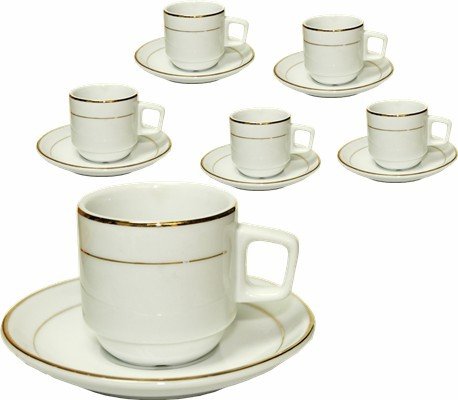 Product Description Ideal for the delicious Cuban Coffee or an espresso. Elegant demitasse set with matching plates. Gold trim, bone white finish . 2.25" height x 2.25" diameter. Plate 4.5" La tacita ideal para tomar un sabroso cage cubano con elegancia, Fileteada en oro con su palto. 0
