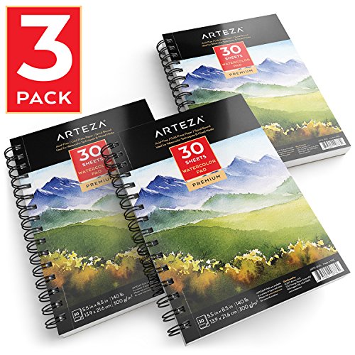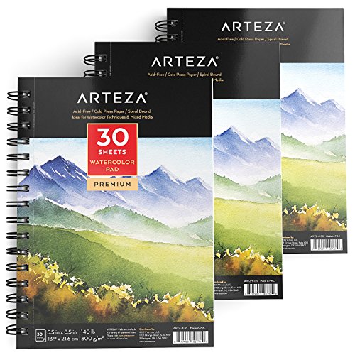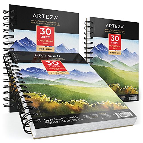Arteza Watercolor Pad, 3 Pack, 5.5"X8.5" Painting & Drawing Paper Sketchbooks, 90 Sheets Total, 140 lb./300gsm Cold Pressed Paper, Acid Free, Perfect for Wet, Dry & Mixed Media Painting
