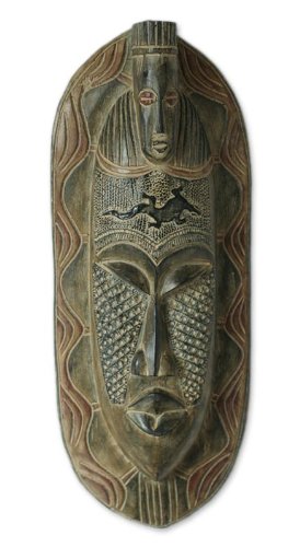 NOVICA Decorative Ghanaian Large Sese Wood and Aluminum Mask, Beige 'Playful Lizard'