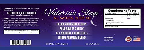 -. Binding : Health and Beauty -. Brand : Valerian Sleep -. Color : Green -. EAN : 0700425835019 -. Feature : Valerian Sleep is a premium, safe and non-habit forming, all natural sleep aid. / Valerian Sleep contains a blend of three ingredients including Valerian Root, GABA, and Melatonin. / For thousands of years, the Chinese, Greeks, Romans, and Indians have used valerian as a sedative. / Melatonin helps control your sleep and wake cycles. Natural melatonin levels slowly drop with age. / GABA - it's full scientific name is gamma-aminobutyric acid - occurs naturally in your brain, where it functions as a neurotransmitter and helps regulate brain activity. You can get small amounts from food, but most of it is synthesized in your body from glutamate. Many of the medications and remedies for anxiety that are used today affect the levels of GABA and how it works in your brain. -. IsAdultProduct : 0 -. Label : Valerian Sleep -. LegalDisclaimer : The product statements on this page have not been evaluated by the FDA. This product is not intended to diagnose, treat, or cure any disease. -. Manufacturer : Valerian Sleep -. ProductGroup : Health and Beauty -. ProductTypeName : HEALTH_PERSONAL_CARE -. Publisher : Valerian Sleep -. Studio : Valerian Sleep -. Title : Valerian Sleep Aid Natural & Safe Premium Sleeping Pills with Melatonin, Valerian and More, 60-count -. UPC : 700425835019