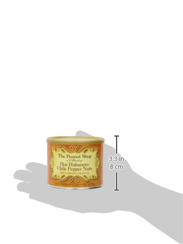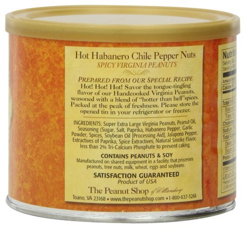 -. Binding : Grocery -. Brand : The Peanut Shop of Williamsburg -. EAN : 0053136896528 -. Feature : Distinctively unique and different And unbelievably crisp / Our same Super Extra Large Handcooked Virginia Peanuts are lightly seasoned in a variety of flavors / Try a tin for yourself and give several as gifts to those you wish to receive the finest -. Label : The Peanut Shop of Williamsburg -. Manufacturer : The Peanut Shop of Williamsburg -. Model : 89652 -. MPN : 89652 -. NumberOfItems : 1 -. PackageQuantity : 1 -. PartNumber : 89652 -. ProductGroup : Grocery -. ProductTypeName : GROCERY -. PublicationDate : 2012-04-26 -. Publisher : The Peanut Shop of Williamsburg -. Size : 10.5 Ounces -. Studio : The Peanut Shop of Williamsburg -. Title : The Peanut Shop of Williamsburg Hot Habanero Chile Pepper Nuts, 10.5-Ounce Tin -. UPC : 053136896528