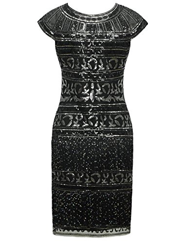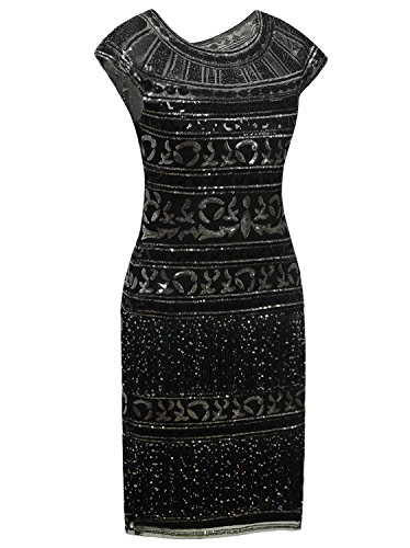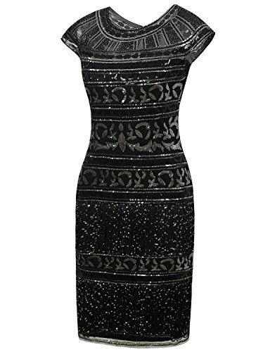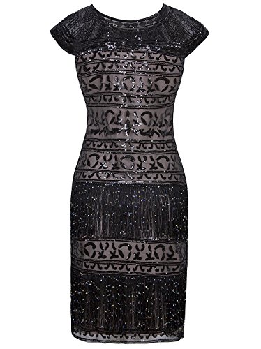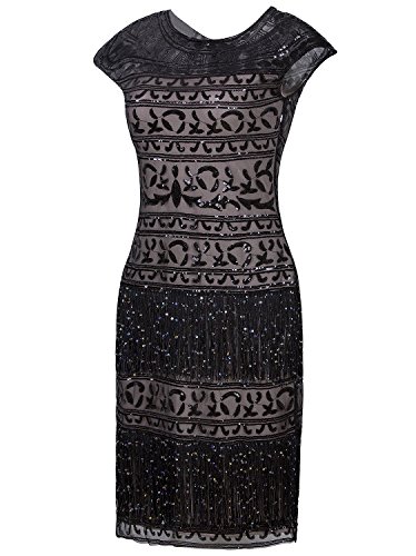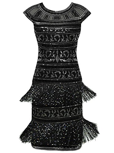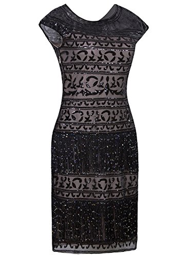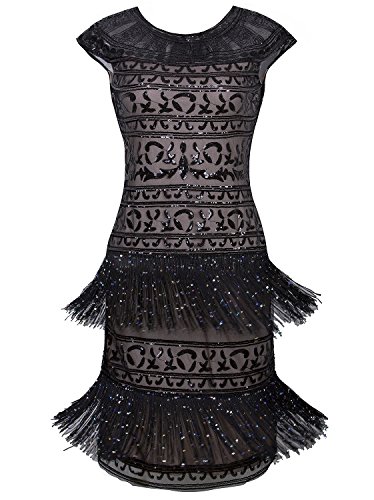 Vijiv Vintage 1920s Inspired Shawl Sleeve Sequin Layer Tassel Flapper Cocktail Dress,Black,S