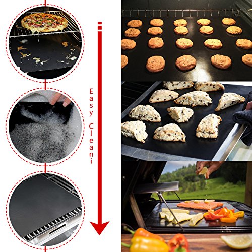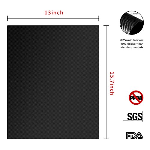 - MADE FROM TOP QUALITY MATERIAL: Our barbecue cooking mats are made from 100% PFOA Free materials and premium PTFE-Fiber glass coating, thin for better heating, no harm to human health and certified as safe by FDA approvded, also safe for using on the top shelf or your dishwasher.