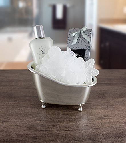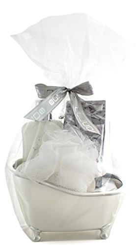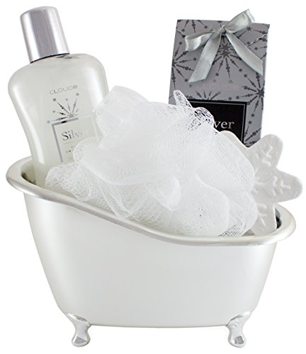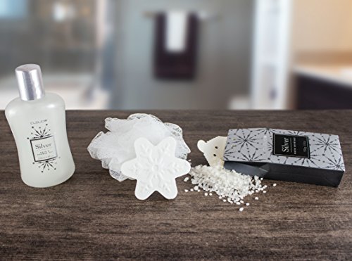 The gift set includes 6.8 fl.oz (200 ml) shower gel, 5 oz (150 g) bath salts, a bath fizzer 1.5 oz. (45g), an exfoliating sponge made of nylon and a silver-colored plastic tub.