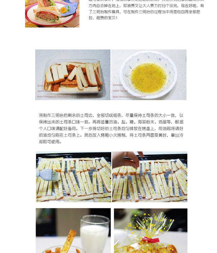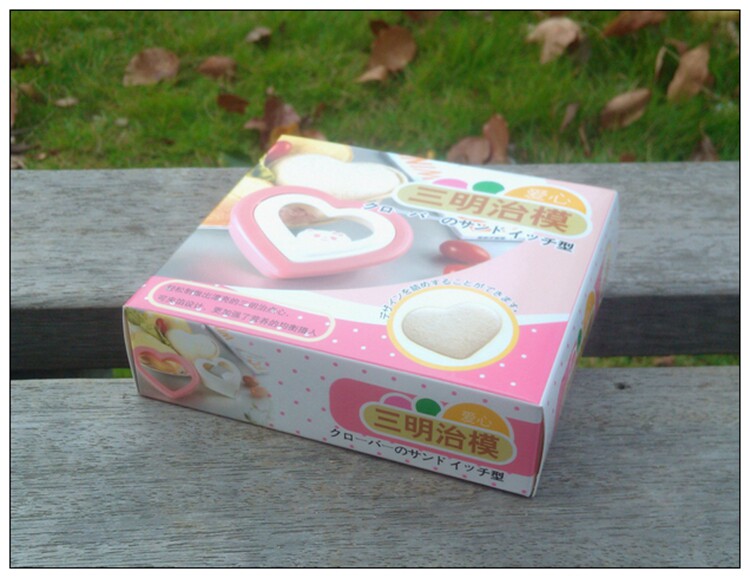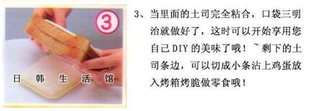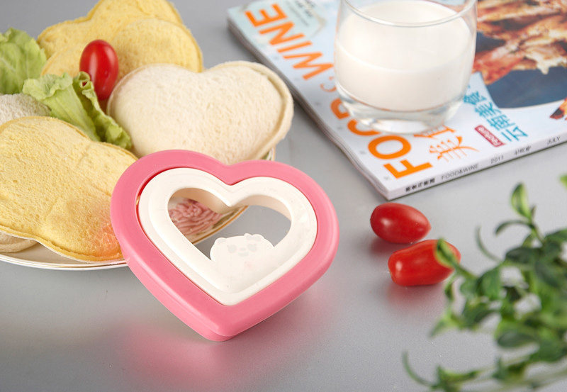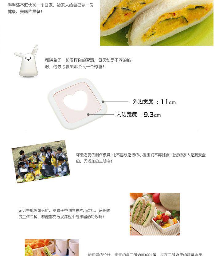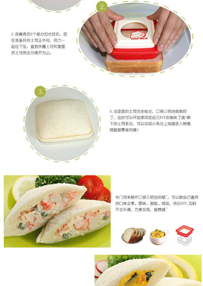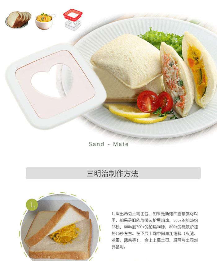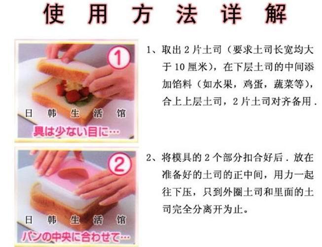 使用方法: 先准备好片状的三明治和夹馅,在两片三明治中间放入夹馅,把模具放在三明治上面用力压下,拿掉碎边和模具,一个可爱美味的三明治点心就做好了。