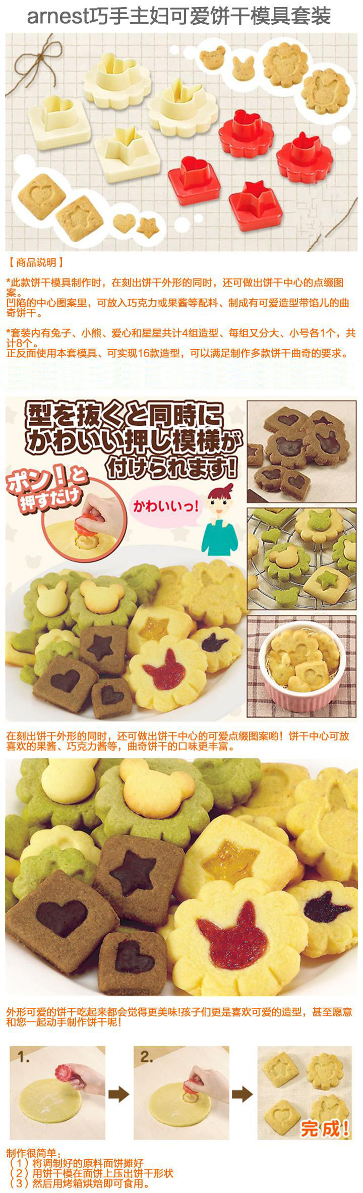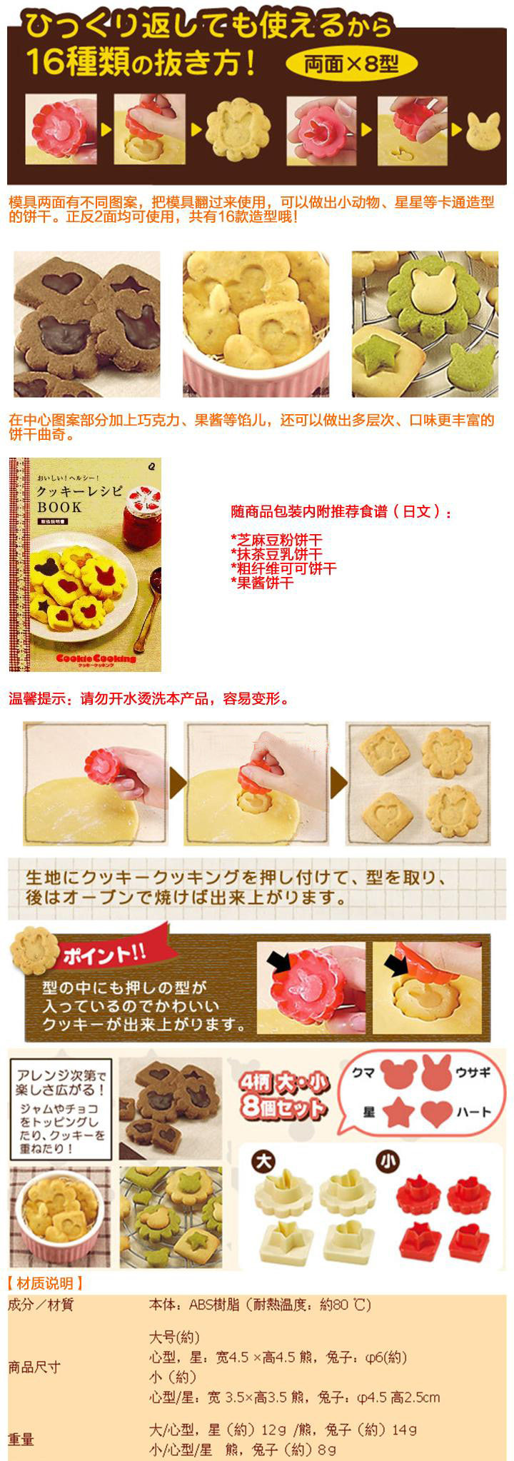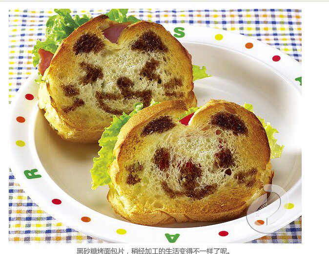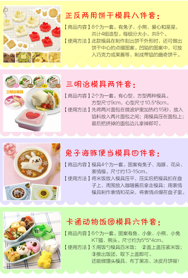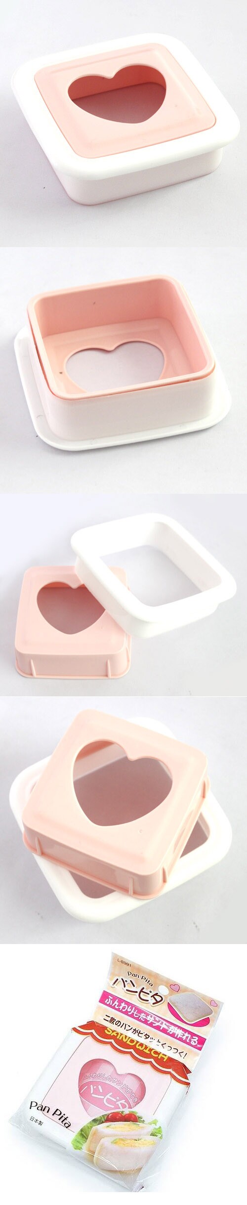 使用方法: 先准备好片状的三明治和夹馅,在两片三明治中间放入夹馅,把模具放在三明治上面用力压下,拿掉碎边和模具,一个可爱美味的三明治点心就做好了。