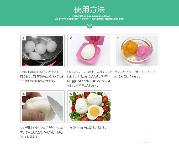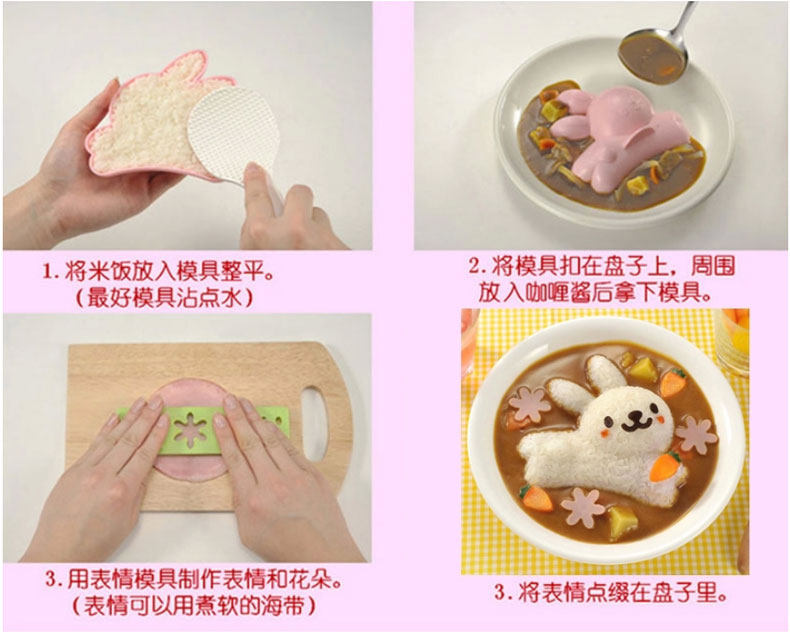 【使用方法】①用饭勺模具舀米饭; ②盖上盖压紧米饭;