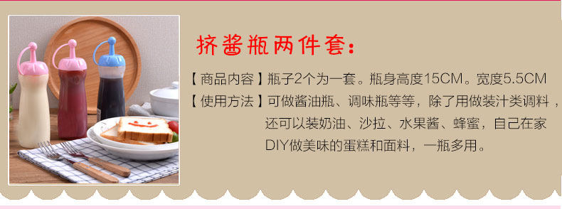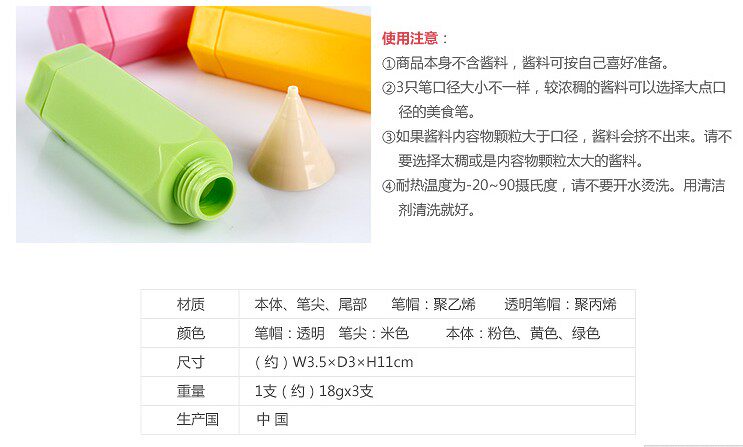 ③如果酱料内容物颗粒大于口径,酱料会挤不出来。请不要选择太稠或是内容物颗粒太大的酱料。