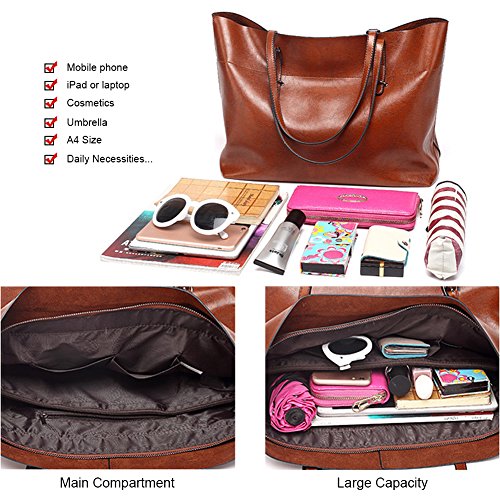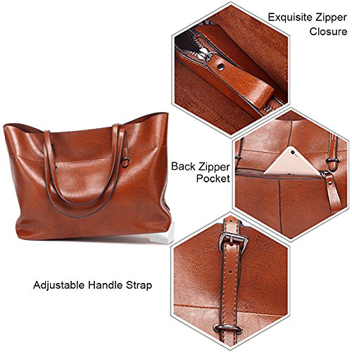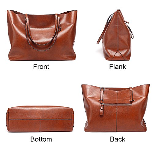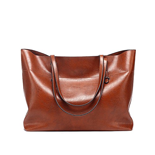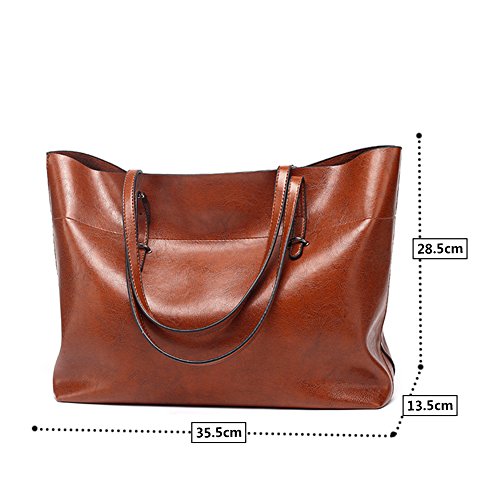 VECHOO Women's Vintage Oil Wax Leather Tote Large Capacity Shoulder Bag Handbag Shopping Bag (Brown)