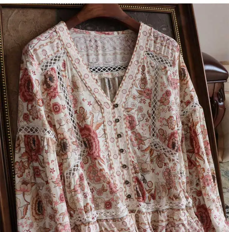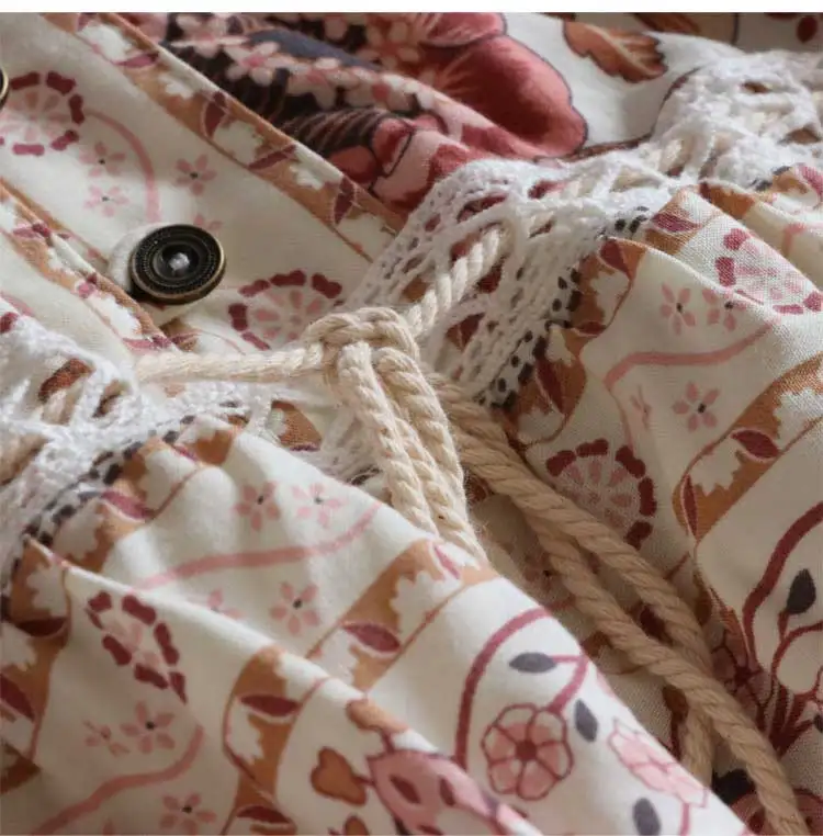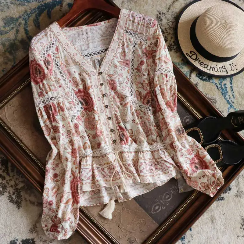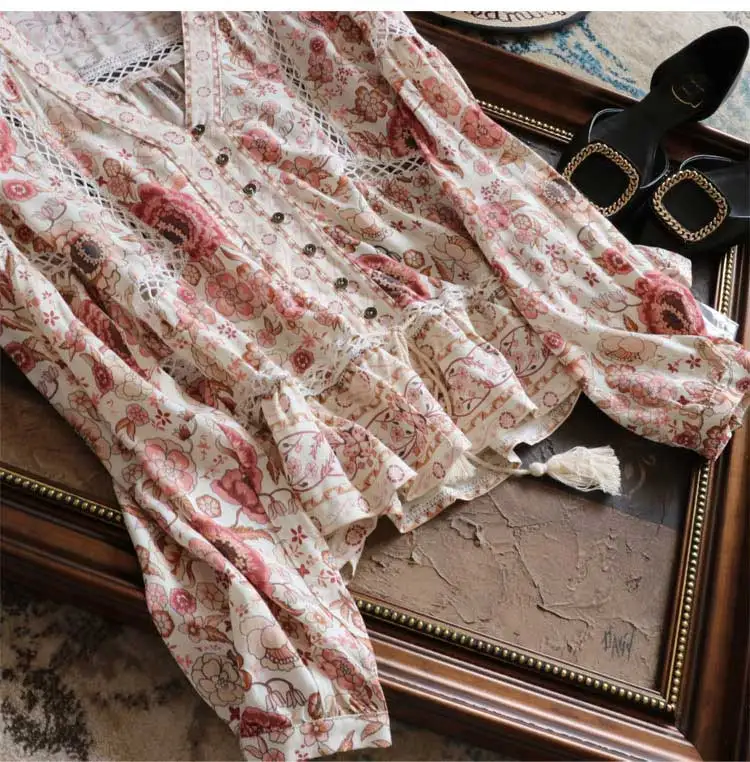 Feature:floral print buttons front V-neck tassel tied long sleeve