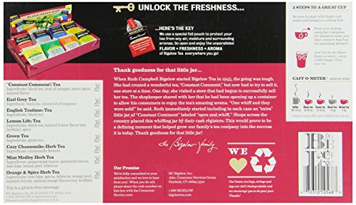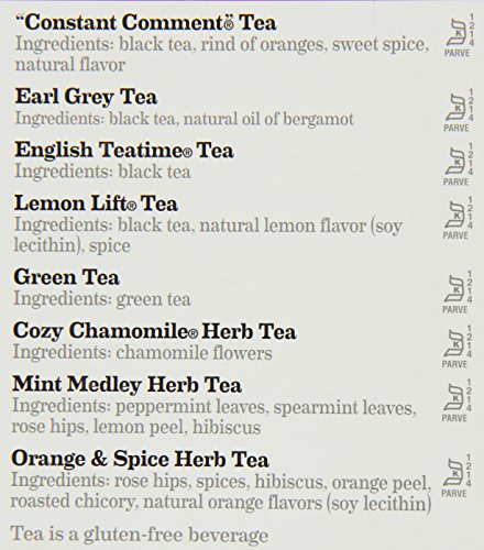 -. Feature : Pack of two 64-count boxes of calorie-free tea in eight assorted flavors (128 total tea bags) / An assortment Earl Grey, Lemon Lift, English Teatime, Green Tea, Cozy Chamomile Herb Tea, Mint Medley Herb Tea, and Orange and Spice / Gluten free, with no calories and no carbohydrates; Kosher Parve / Soothes the senses while delivering healthful antioxidants / Blended and packaged in the U.S.A.