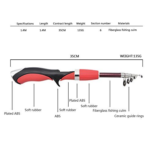 -. Feature : PERFECT SET: This portable fishing kit is special made for novice, including necessary accessories for fishing: Fishing Rod+ Fishing Reel+ Fishing Bag. / FISHING ROD: Extended length: 1.4m, Closed length: 35cm. 6 adjustable sections,made of CARBON FIBER, durable and sturdy to use. / FISHING REEL: Size: 91*91*67mm, ABS and metal material. Suitable for portable baitcasting rod and fishing gun. / FISHING BAG: 50cm length, made of 600D oxford material with single layer, contain 2 zipper pockets, waterproof, portable and durable. / The telescopic fishing rod is portable, and closed length design is convenient carrying around.