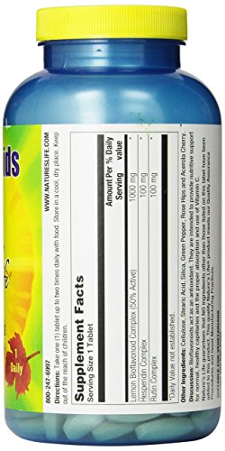-. Binding : Health and Beauty -. Brand : Nature's Life -. Feature : 2 Bottles of 250 Tablets / Nature's Life bioflavonoids lemon / Contains bioflavonoids / Contains 50 tablets -. Label : Nature's Life -. Manufacturer : Nature's Life -. ProductGroup : Health and Beauty -. ProductTypeName : HEALTH_PERSONAL_CARE -. Publisher : Nature's Life -. Studio : Nature's Life -. Title : Nature's Life Bioflavonoids Tablets, Lemon, 1000 Mg, 250 Count Bioflavonoids antioxidant activity help to maintain strength and flexibility of capillaries and support for good circulation.