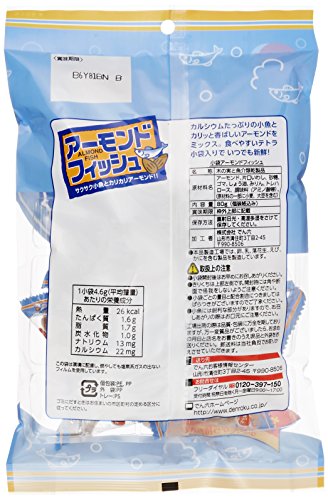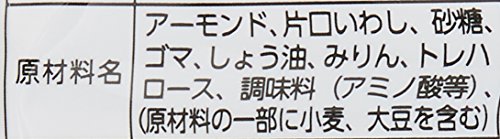 原材料:アーモンド、片口いわし、砂糖、ゴマ、しょう油、みりん、トレハロース、調味料(アミノ酸等)、(原材料の一部に小麦、大豆を含む)