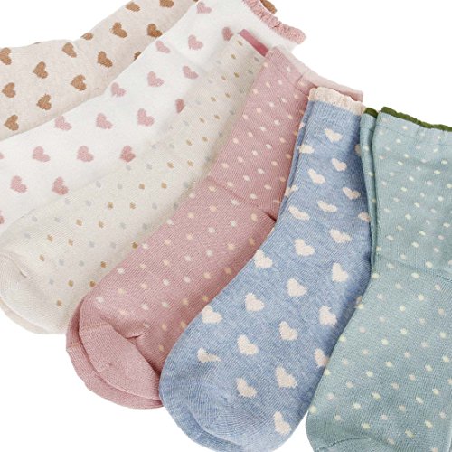 Get 6 pairs of womens ankle high socks with simple girly designs. This set comes in colors white, brown, beige, pink, blue, turquoise with a heart pattern and polka dot design. All socks are constructed with dry fit smooth toe seam and are labled One Size that fits womens size 7-12 comfortably. *NOTE*: Due to differences between monitor displays, actual color may vary slightly from image. Bundle Monster is a registered trademark of Remi Collections LLC and is exclusively distributed by Bundle Monster. Bundle Monster trademark is protected by Trademark Law.Feature
