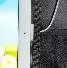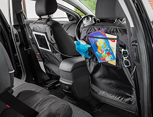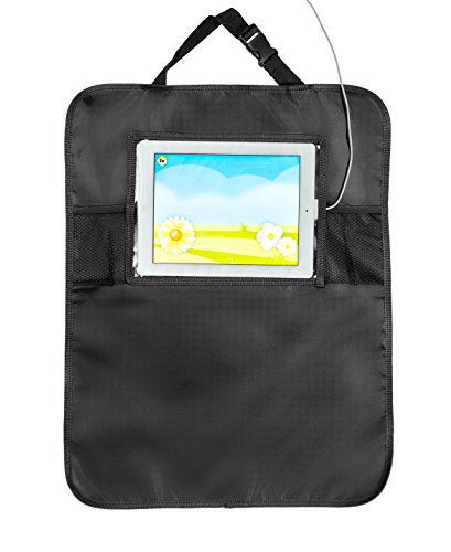 -. Feature : DURABLE & STYLISH DESIGN & PROTECTS YOUR INVESTMENT: Our large 17" x 22.5" kick mat is designed to cover and protect your entire seat back from unwanted dirt and mud stains that come from your children's dirty shoes and boots. This iPad holder and Car seat organizer is compatible with all types of front car seat, with straps that fit perfectly for all makes of Cars, Trucks, SUV, Van with different styles of seats and headrests. / EASY TO INSTALL - GREAT FIT: The straps and buckles are easily adjustable, so you can install and set the it up according to your preference. The elastic strap guarantees a stud and comfortable fit. Simply wrap and snap the nylon strap around the bars of your vehicle's headrest of your driver or passenger seat, then snap the elastic strap around the lower part of the seat. And best of all, the elastic straps never inconvenience you, the driver. You won't even know they're there! / BACK SEAT ORGANIZER FEATURES: Kick Mat Size: 17" x 22.5" (44cm x 57cm). Nylon straps with snaps for safe upper fastening, and elastic straps with snaps for comfortable lower fastening, that keeps the kick mat in place. Protective IPAD Pocket: The 10.2" touch screen pocket allows convenient access to the screen/display of your Android or iOS Tablet. / WATERPROOF AND WASHABLE: Easy-to-clean heavy-duty waterproof polyester fabric. Just simple wipe off any dirt with a wet cloth. Rainy and wet days, Kids with muddy shoes will no longer bother you. / GIFT & SATISFACTION GUARANTEE: Makes a great gift for all moms and dads. If, for any reason you are not satisfied, the manufacturer, Eagleys, offers hassle free, 100% money-back guarantee.