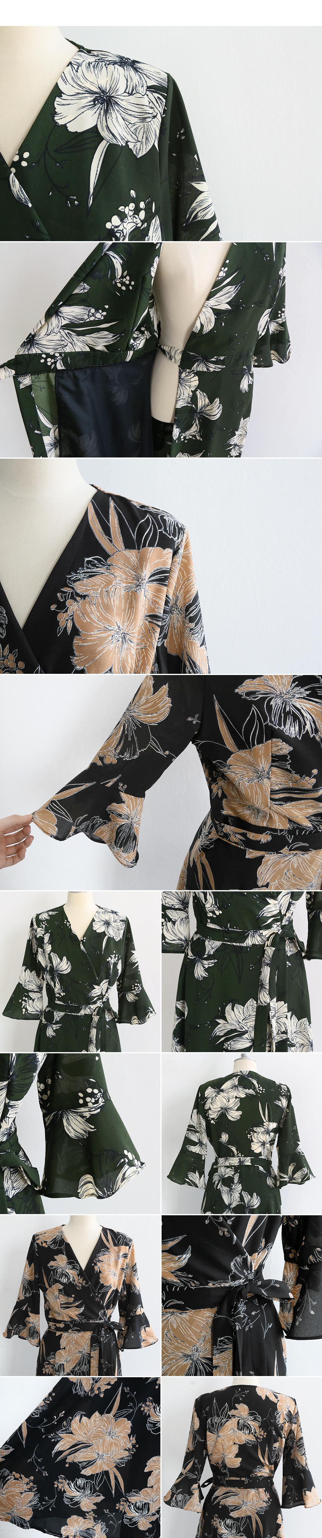 7부 기장의 소매 프릴과 커다란 플라워 패턴으로 포인트를 주었고요