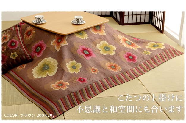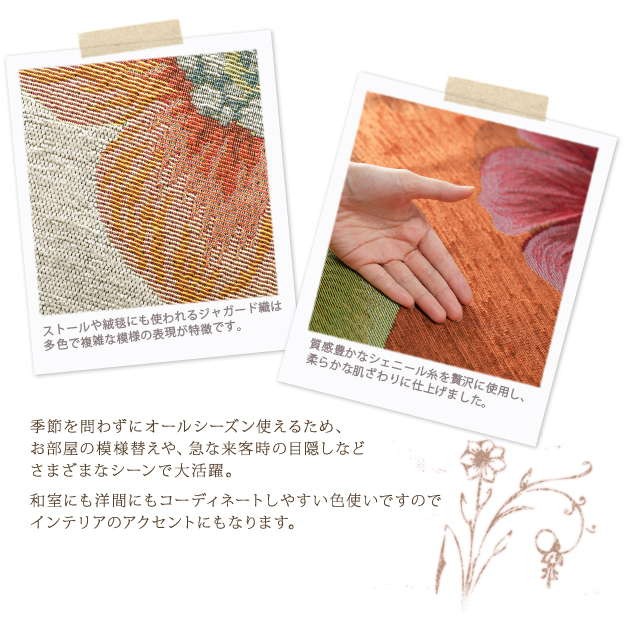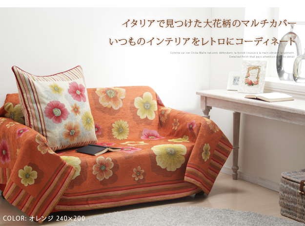商品について:イタリア製ファブリックを使用したマルチカバー。ベッドやコタツにかけるだけ。ラグの代わりにもオススメ。大小に散りばめられたアネモネ柄で気分も明るくリフレッシュ。