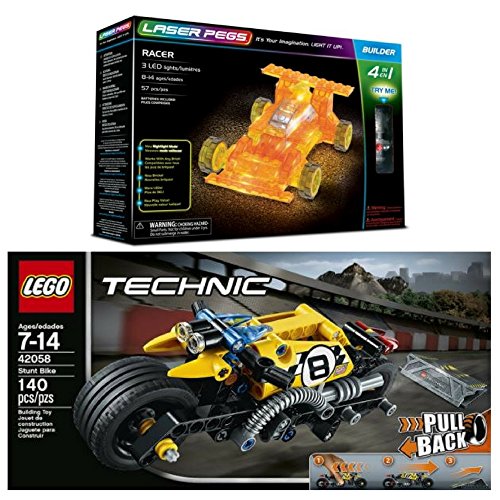 -. Feature : Laser Pegs Racer 4-in-1 Building Set Building Kit includes 57 pieces total, 56 construction bricks, 1 light up power brick with 3 LEDs total, batteries & instruction manual. 100% compatible with other major construction bricks and building block sets. / This construction set and its bricks are compatible with all Laser Pegs kits and all other major construction brands such as L.E.G.O®, Mega Bloks®, Magformers®, Magna Tiles®, Tegu®, Playmobile®. Construction bricks are educational and stimulate imagination and creativity with unlimitied building possibilities. / L.E.G.O Technic Stunt Bike 42058 includes a powerful pull-back motor, extra-wide rims with low profile tires, front and rear lights and an authentic exhaust. A uniquely decorated L.E.G.O® Technic 40th Anniversary brick is included with this model. Activate the pull-back motor to send the high-speed Stunt Bike hurtling toward the stunt ramp. Stunt Bike measures over 2" (7cm) high, 7" (18cm) long and 2" (7cm) wide, Ramp measures over 4" (12cm) wide, 3" (9cm) deep and under 1" (2cm) high. / Laser Pegs and L.E.G.O are a classic building toy allowing kids to build anything from helicopters to robots, monster trucks to animals, or dinosaurs to spaceships! All Laser Pegs kits can build multiple models and can be combined with all major building blocks such as L.E.G.O®, Knex®, Mega Bloks®, Magformers®. / Laser Pegs are a recognized as an award-winning toy & honored with over 46 national awards, Laser Pegs are a perfect building toy for girls and boys! Great for birthday gifts, Christmas gifts, Chanukkah gifts, Easter gifts, STEM, summer camp activities, back to school. Laser Pegs are the perfect compliment to any L.E.G.O® kit!